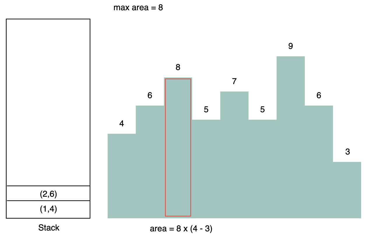 마찬가지로 높이가 6인 블록 또한 5보다 크기 때문에 스택에서 꺼내 넓이를 계산해 준다.