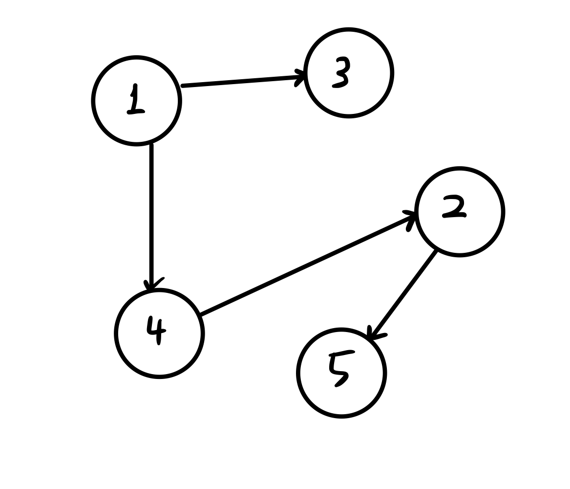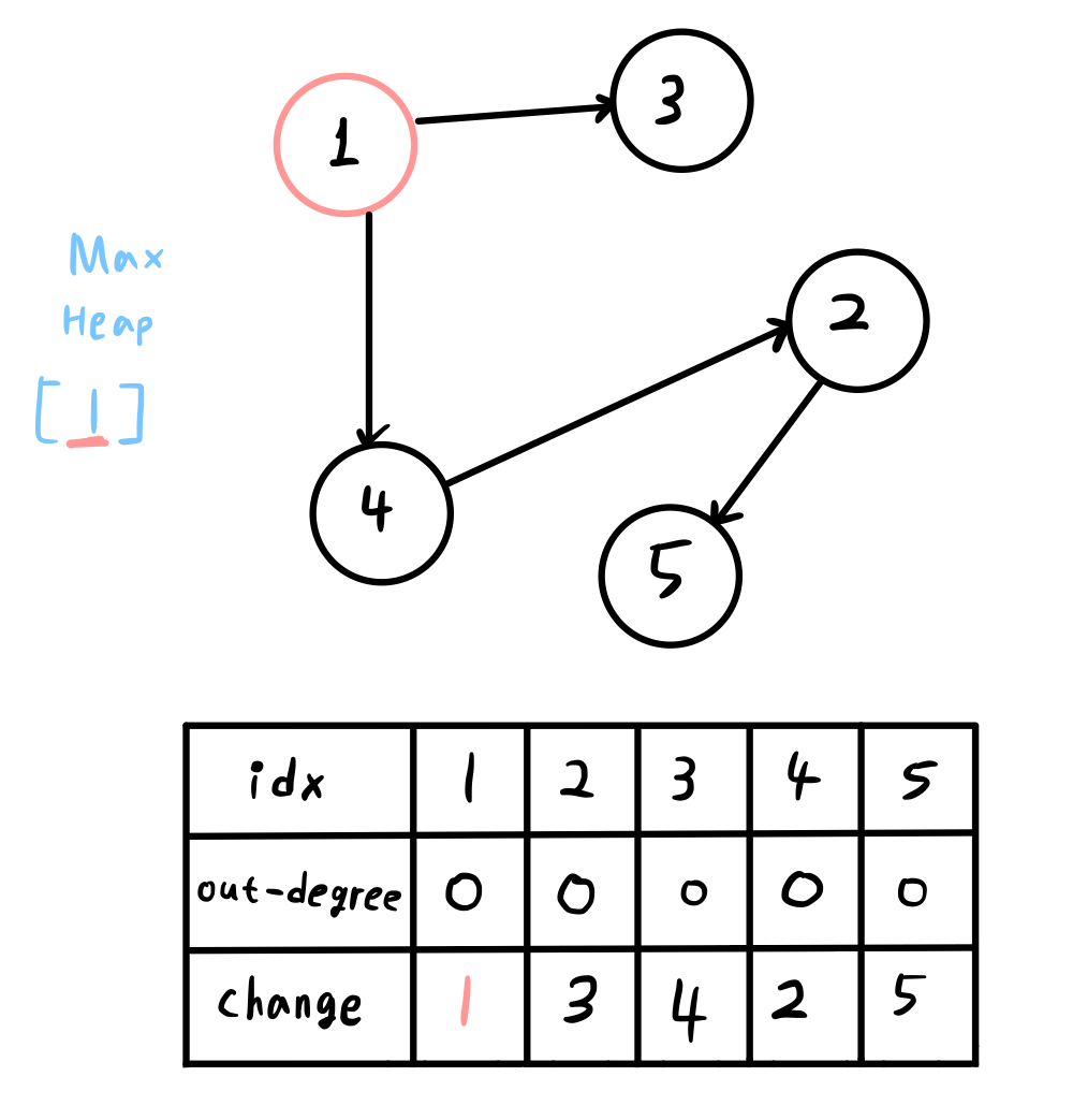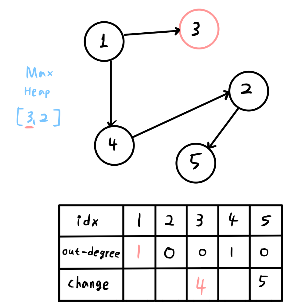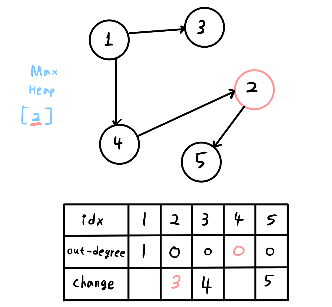 먼저 out-degree가 0인 5번 노드와 3번 노드를 큐에 추가한다. 큐에서 원소를 꺼낼 때마다 해당 노드에 현재까지 부여한 번호를 제외한 나머지에서 가장 큰 번호를 부여하는데, 이를 큰 노드에 큰 값을 부여하기 위해서 최대힙을 사용한다. 따라서 5번 노드에서 시작하게 되고, 5번 노드와 연결된 2번 노드의 out-degree 값을 1만큼 감소시킨다. 이후 2번 노드의 out-degree가 0이 되었으므로 큐에 추가해 준다.