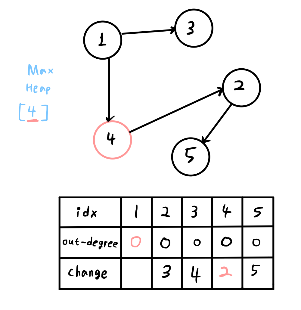 먼저 out-degree가 0인 5번 노드와 3번 노드를 큐에 추가한다. 큐에서 원소를 꺼낼 때마다 해당 노드에 현재까지 부여한 번호를 제외한 나머지에서 가장 큰 번호를 부여하는데, 이를 큰 노드에 큰 값을 부여하기 위해서 최대힙을 사용한다. 따라서 5번 노드에서 시작하게 되고, 5번 노드와 연결된 2번 노드의 out-degree 값을 1만큼 감소시킨다. 이후 2번 노드의 out-degree가 0이 되었으므로 큐에 추가해 준다.