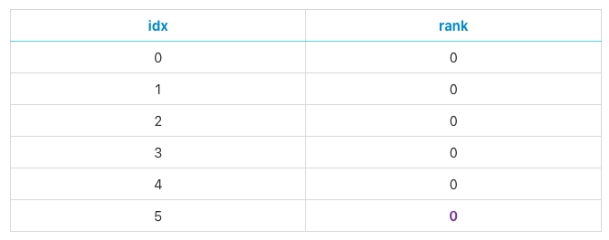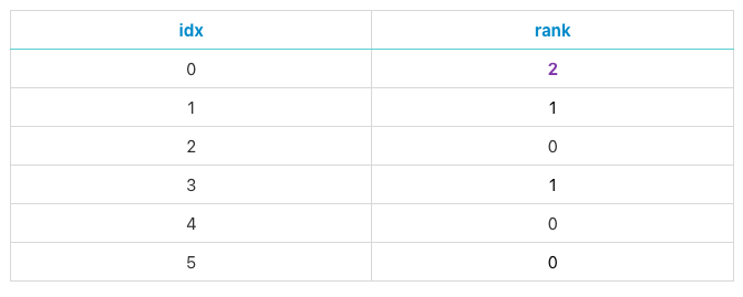 현재 anana와 a의 이전 rank를 비교했을때, 둘의 rank 값이 0으로 같은것을 볼 수 있다. 따라서 2만큼 떨어진 위치의 문자를 비교하는데, a의 경우 2만큼 떨어진 위치는 범위 밖이므로 rank 값을 -1로 설정하여 비교한다. 따라서 a의 rank 값이 anana의 rank 값보다 작기때문에 둘은 다른 rank를 가져야함을 알 수 있고, anana의 rank 값은 a의 rank 값인 0에 +1을 하여 1이 된것을 볼 수 있다.