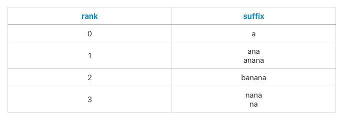 다음으로 banana를 검사하는데, 이는 이전의 접미사 ana와 이전의 rank 값조차 다르기때문에 ana의 rank보다 1 높은 값을 갖게된다.