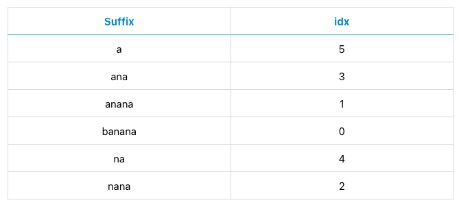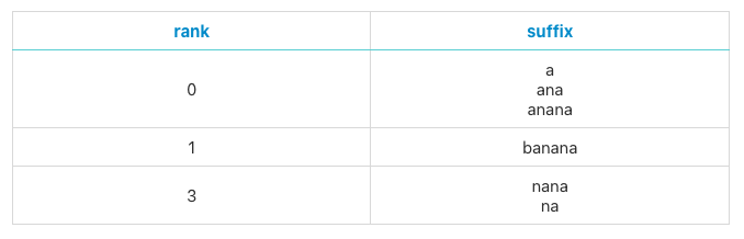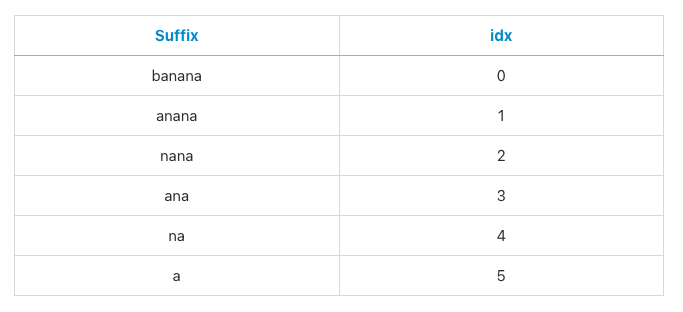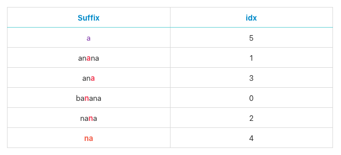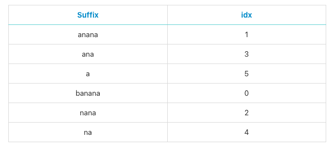 위의 표에서는 banana를 예시로 들었다. banana의 접미사들을 나열하였고, 이를 모두 배열에 담아버리면 메모리 낭비가 심해질 수 있기때문에 실제 배열에는 접미사의 시작 부분이 실제 문자열에서 어느 위치에 존재하는지를 나타내었다.