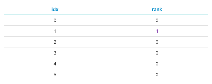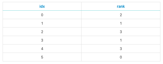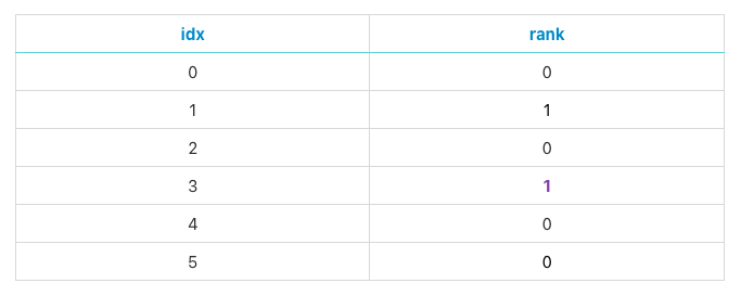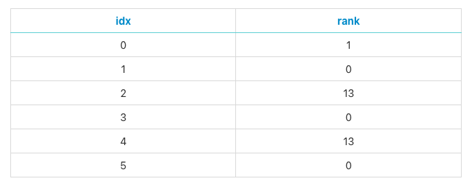 위의 표는 각 인덱스에 속하는 접미사의 rank를 나타낸 것이다. rank는 각 접미사의 맨 앞글자를 기준으로 부여하였으며, 문자 'a'의 아스키코드 값과 차이로 계산하였다.