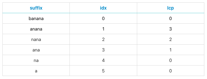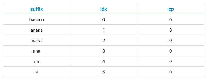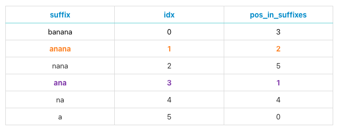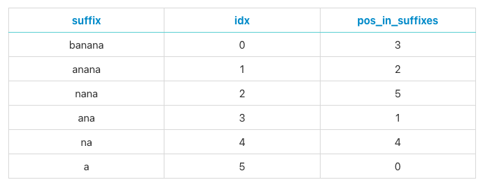 위의 표에서 suffix는 좀 더 수월한 이해를 위해 추가했다. 실제로 배열은 idx와 pos_in_suffixes 값만을 갖는다. 여기서 pos_in_suffixes는 해당 접미사가 정렬된 접미사 배열 안에서 몇번째 인덱스에 위치하는지를 나타낸다.