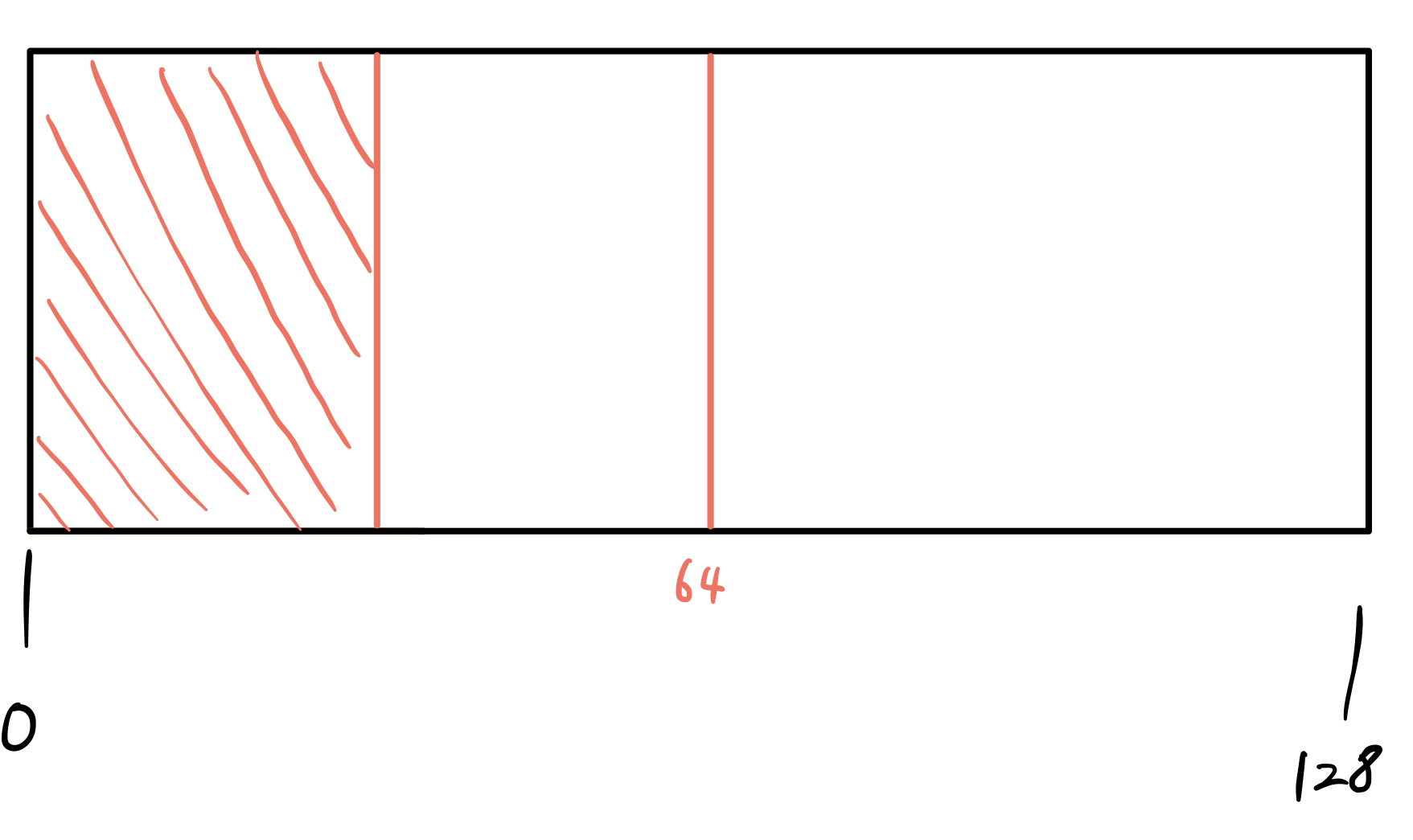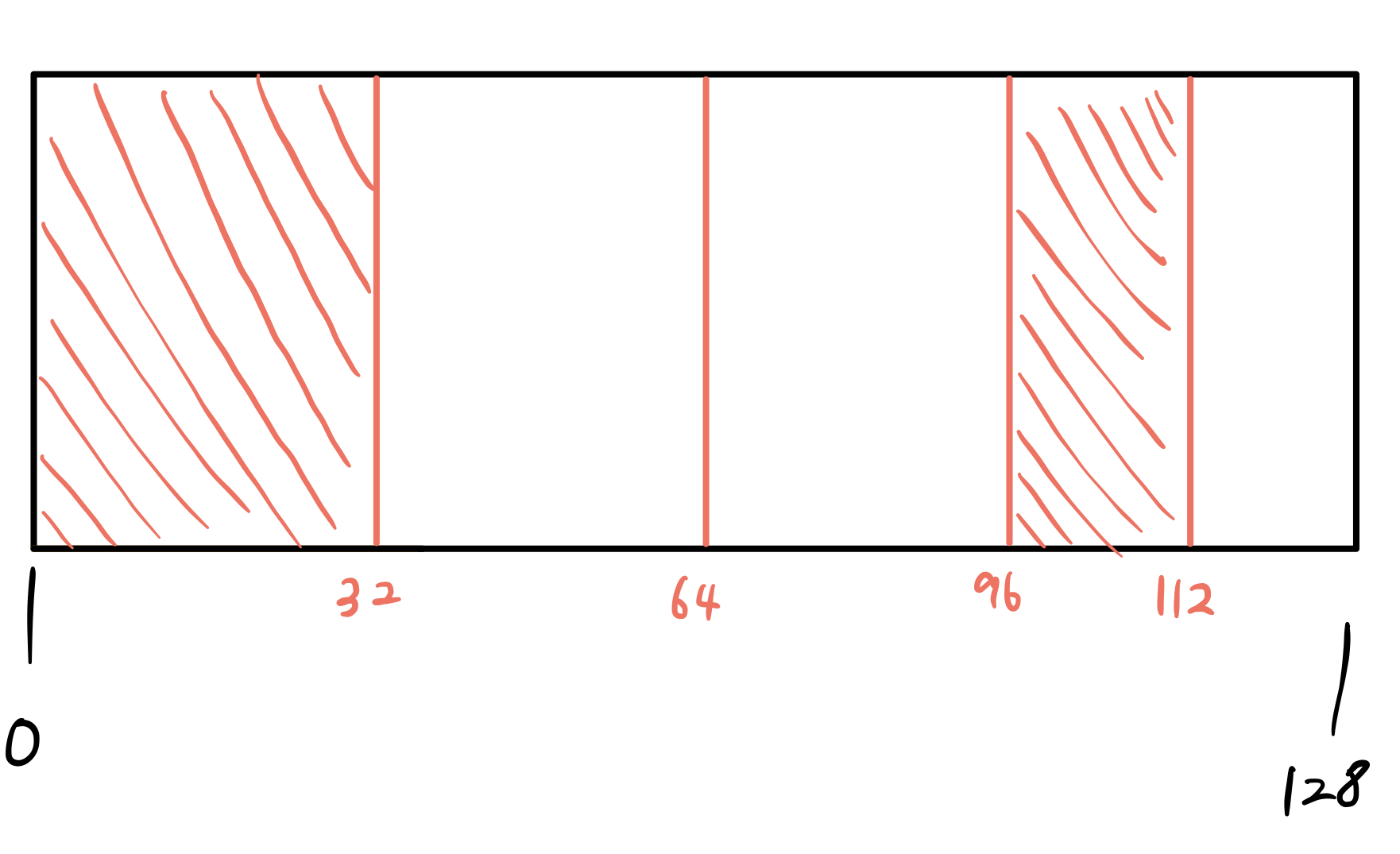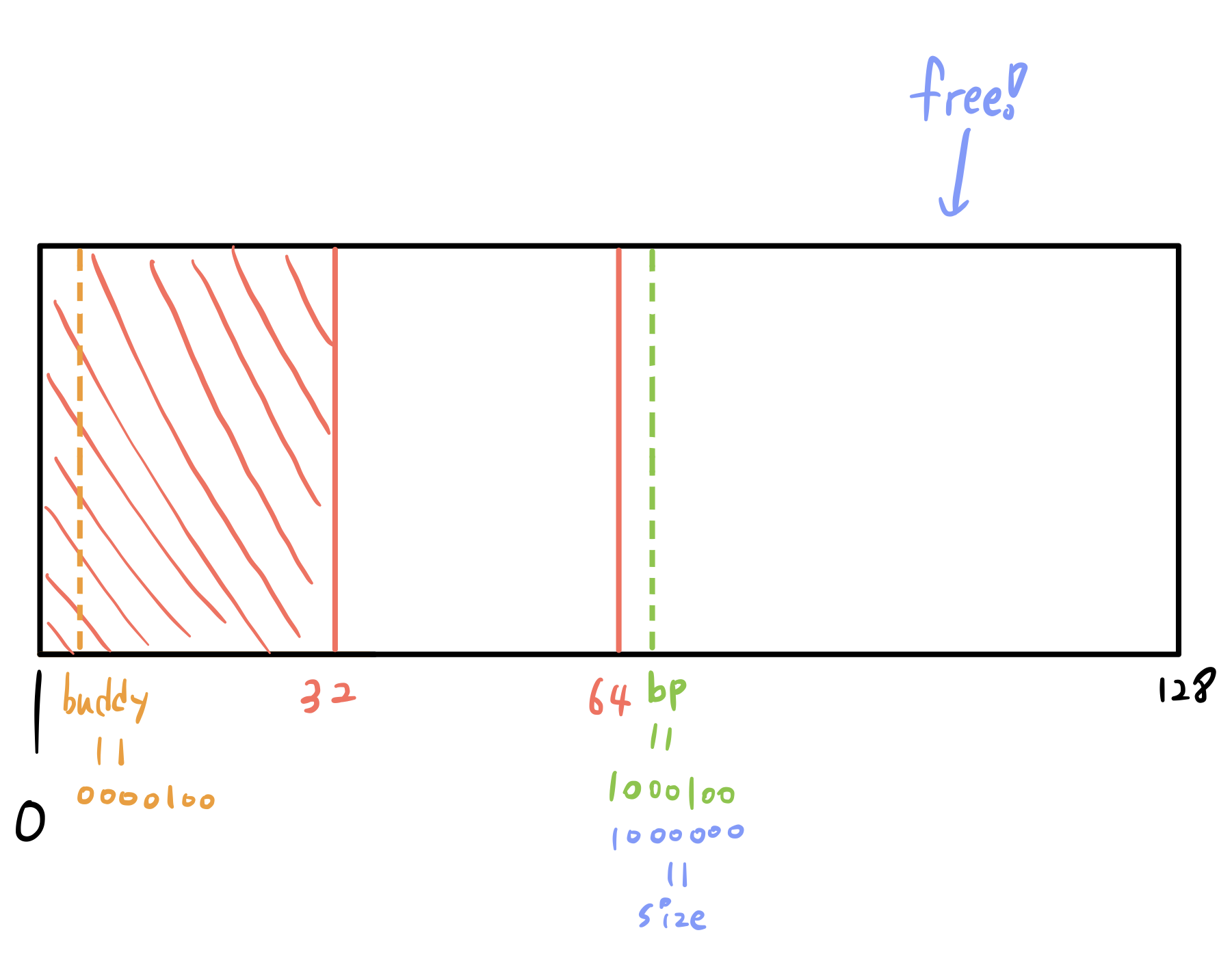 크기가 128인 heap이 있고, 처음에 여기 32 크기의 할당 요청이 들어왔다고 가정해보자. 먼저 지금은 free block이 크기가 128짜리 하나 있으므로 이 block을 할당해 줄 것이다.