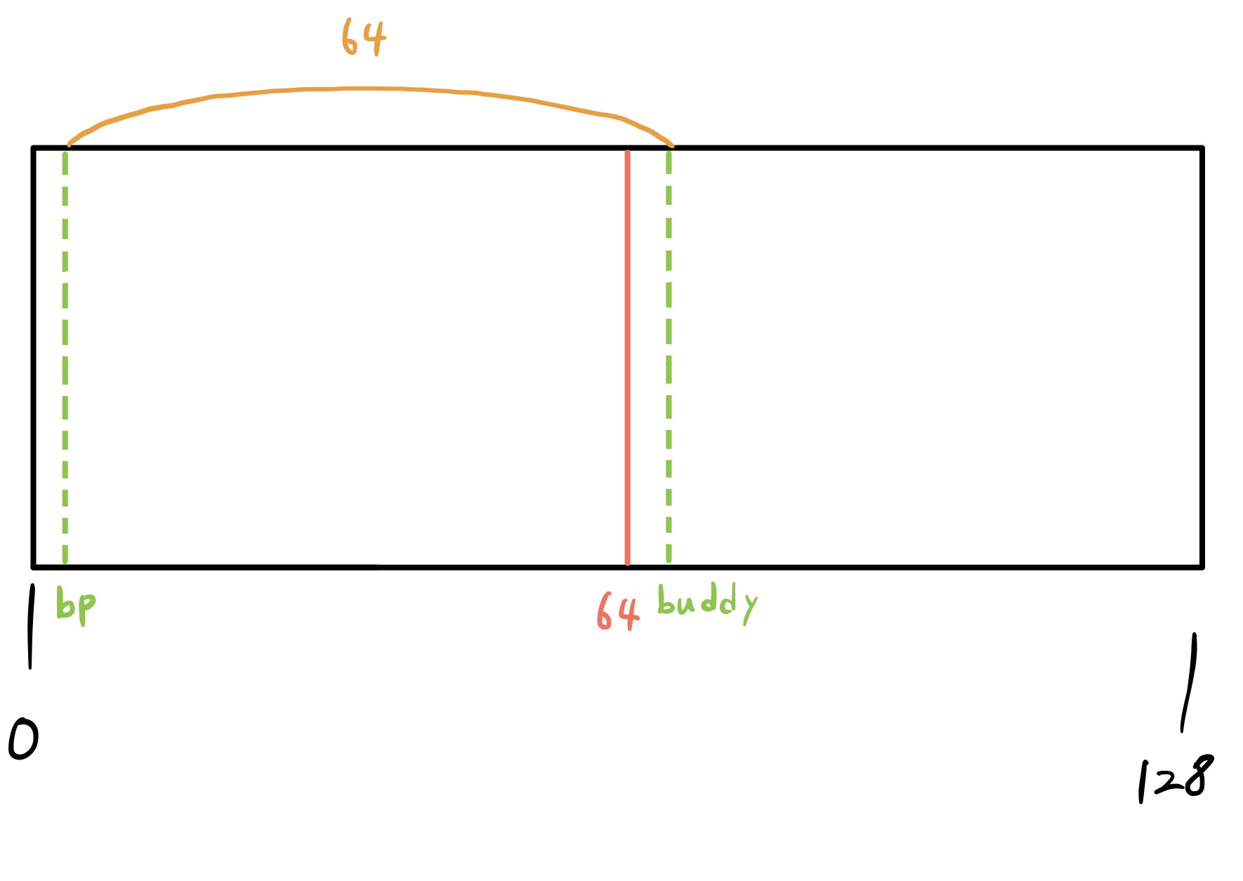 반으로 잘라주고 나면 현재 block의 size는 64이고, bp에 size를 더하면 buddy의 bp를 구할 수 있다. 현재 크기가 너무 커서 반으로 잘라주는 작업을 진행 중이므로, buddy는 free list에 추가된다. 아직 block의 크기가 필요한 크기의 두 배 이상이므로 한 번 더 잘라주고 난 뒤 할당을 진행하면 결과는 다음과 같다.