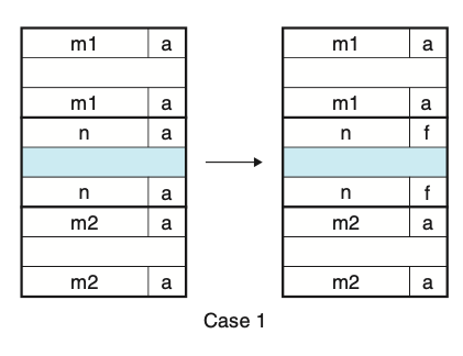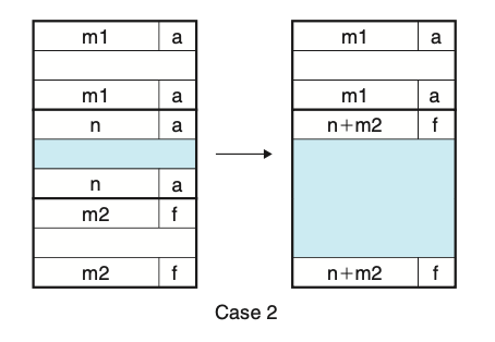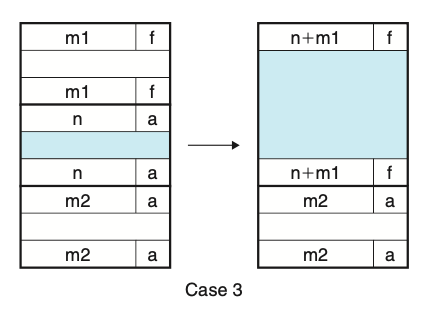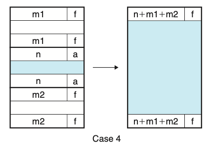 위의 그림은 첫번째 경우이다. 현재 반환된 block의 양 옆이 이미 할당된 block인 경우이다. 이때에는 더 이상 병합할 block이 없으므로 연결 과정을 종료한다.