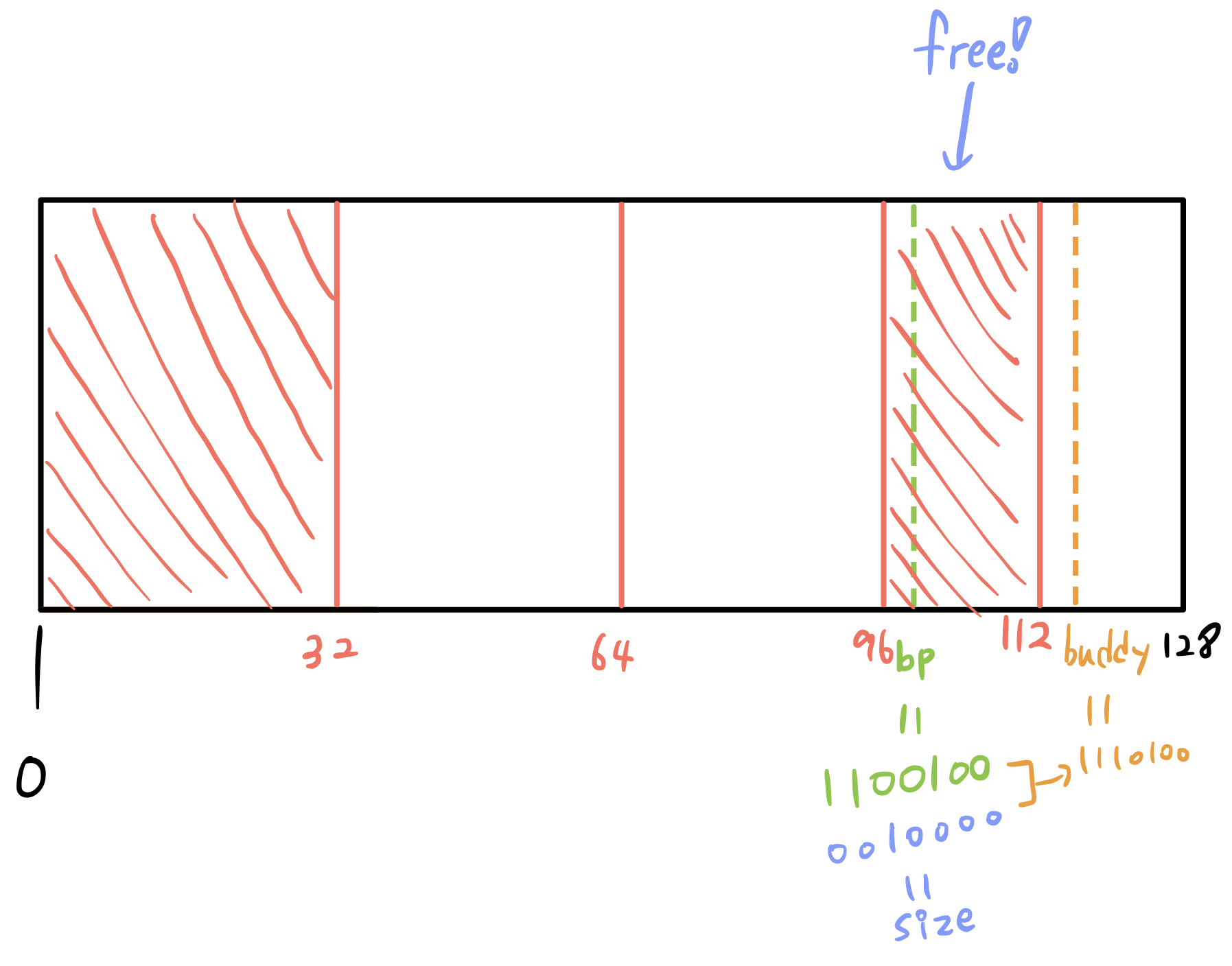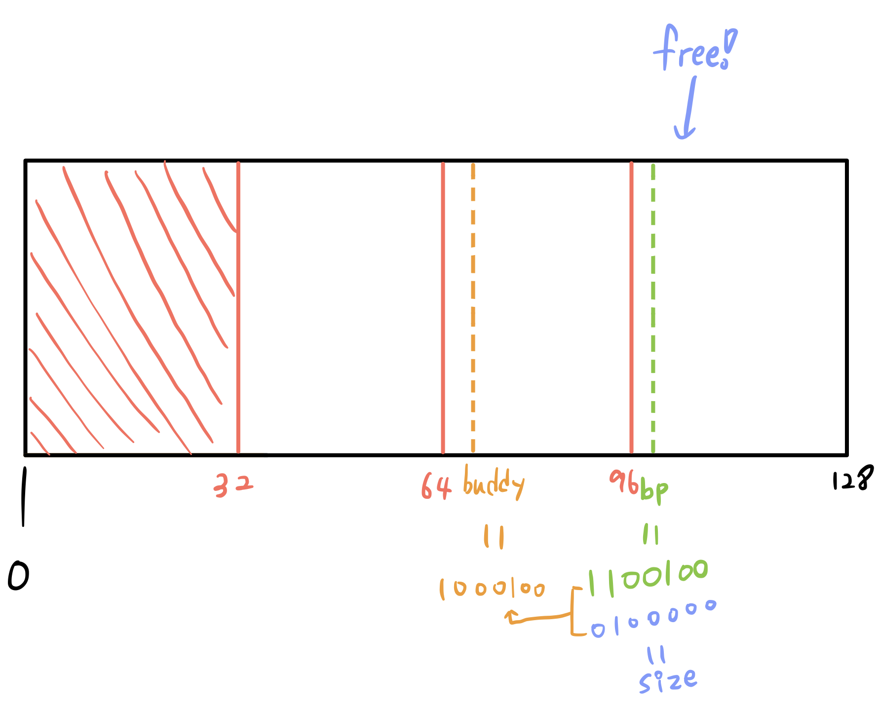 이번에는 size 자리의 bit가 1 이기 때문에, 현재 bp에서 size를 빼면 buddy의 주소가 나올 것이다. 마찬가지로 buddy의 크기와 현재 block의 크기가 같고 free block이기 때문에 연결이 가능할 것이다. 이번에는 buddy가 나보다 주소값이 작기 때문에, bp가 buddy의 bp로 이동한다.
