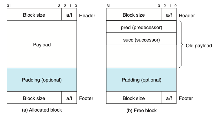 따라서 heap block에 추가적인 정보가 필요하다. 왼쪽은 할당이 되어있는 block이고, 오른쪽은 free block을 나타낸 것이다. free block을 보면 payload 공간에 predecessor와 successor 정보가 들어있는 것을 볼 수 있다. 여기에는 각각 free list 상에서 이전 block과 다음 block의 주소를 담겨있다. 할당이 된 상태에서는 더 이상 이 정보들은 필요가 없으므로 payload 내용으로 덮어쓴다.