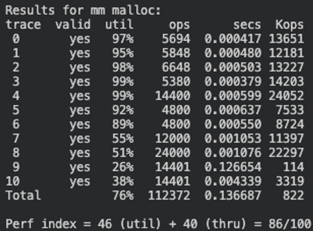 LIFO Policy로 구현하였을 때 score이다. 위의 implicit free list와 비교하였을 때 throughput이 많이 좋아진 것을 볼 수 있다.