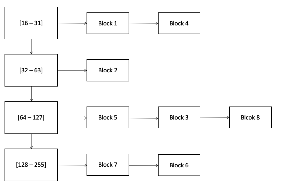 구현할 때에는 위의 그림과 같이 2의 거듭제곱 형태로 class를 나누었다. free list의 class를 관리하는 방법으로는 여러가지가 있는데, 나는 각 class의 첫 free block 주소를 prologue block의 크기를 늘려 prologue block의 payload에 담았다.