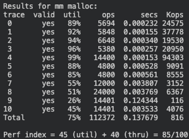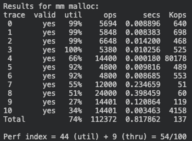 implicit free list 방식으로 test 해보았을 때의 score이다. test case는 카네기 멜런 대학교(CMU)의 Malloc Lab 과제의 case를 사용하였다. 점수를 보면 throughput이 낮게 나온것을 볼 수 있다.