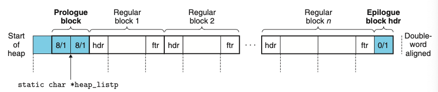 - Prologue block : 반환된 block의 coalesce 과정 또는 탐색 과정에서 경계 조건을 제거하기 위해 추가하는 block이다. payload가 없기 때문에 크기는 8이고 항상 할당된 상태를 유지한다.