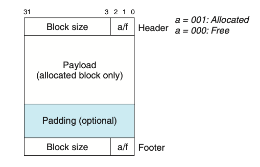 저번 글에서 언급했던 heap block은 explicit allocator를 구현하기에 정보가 부족하다. 할당 요청이 들어오면 블록들을 건너가며 사이즈가 맞는 블록을 찾아야한다. 이때 현재 블록에서 다음 블록으로 넘어가려면 현재 블록의 크기만 있어도 충분히 넘어갈 수 있다. 문제는 반환 요청이 들어올 때 발생한다. 블록이 반환되면 양 옆의 블록의 할당 여부를 검사하여 free block이 존재한다면 합쳐주어야 하는데, 다음 블록은 쉽게 넘어갈 수 있지만 이전 블록은 header의 위치를 찾을 수 없다. 이를 위해 block에 header 뿐만 아니라 header와 완전히 동일한 정보를 가지고 있는 footer를 block의 끝부분에 추가한다.