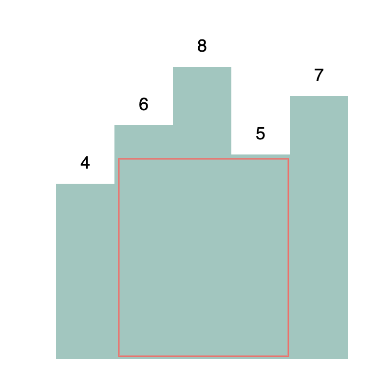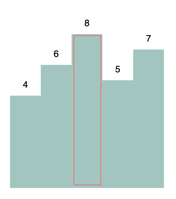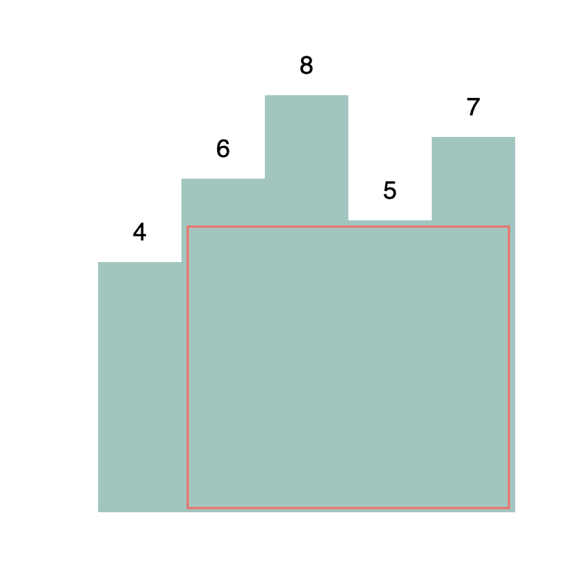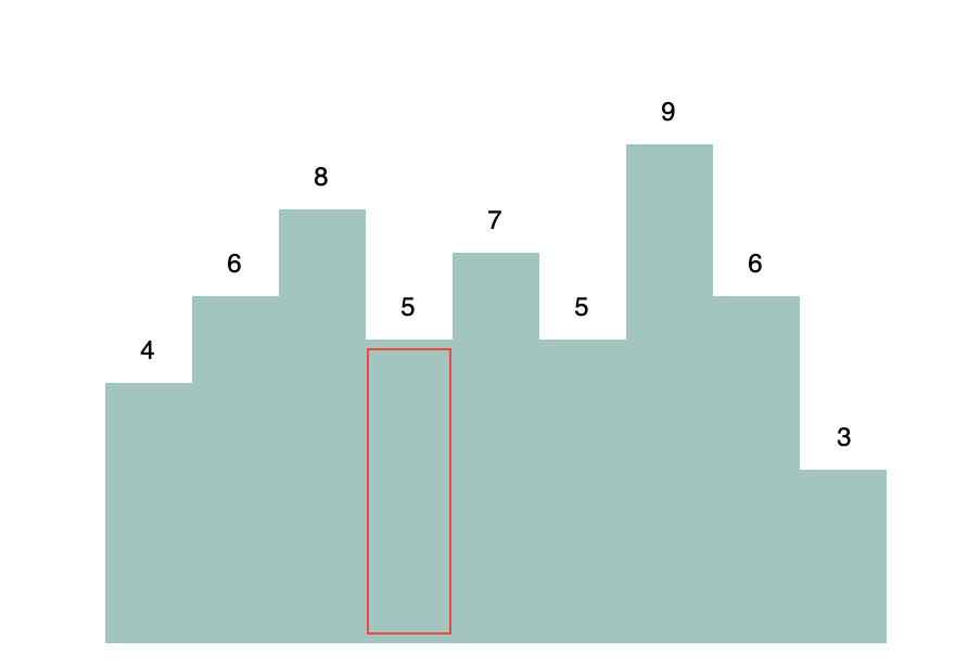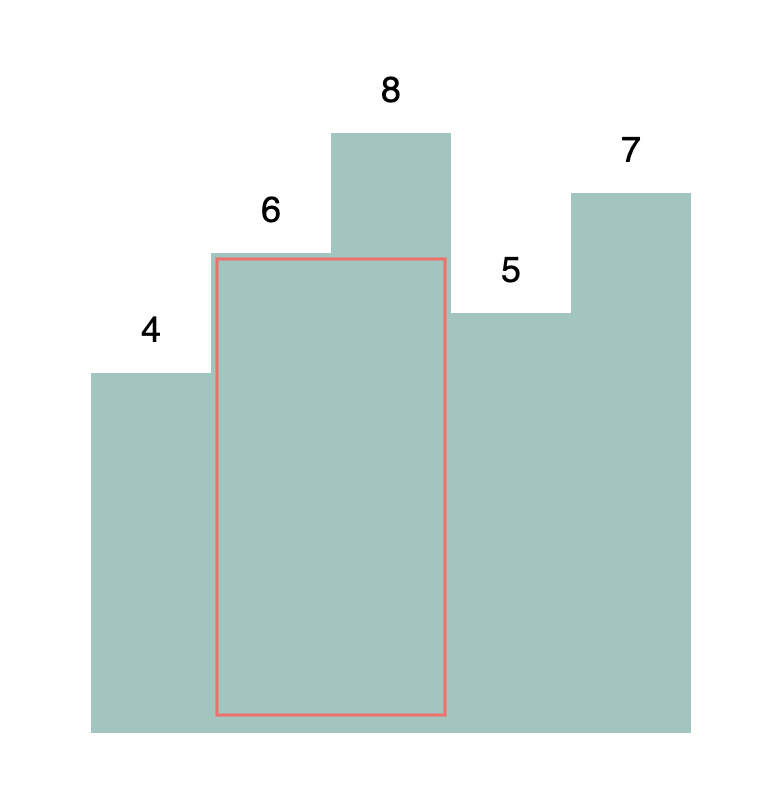 이 문제를 완전 탐색으로 풀기 위해서는 어떤 한 블록을 기준으로 잡았을 때, 그 블록의 높이로 만들 수 있는 직사각형의 넓이를 찾아야 한다. 예를 들어 위의 예시에서 높이가 5인 블록을 기준으로 잡았다고 생각해 보자.