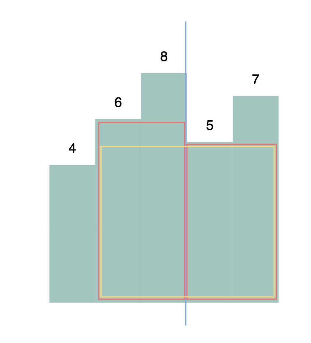 하지만 이러한 풀이에는 문제점이 있다. 넓이가 가장 큰 직사각형이 분할을 하는 기준점을 걸쳐서 존재하는 경우이다. 예를 들면 아래의 그림과 같다.