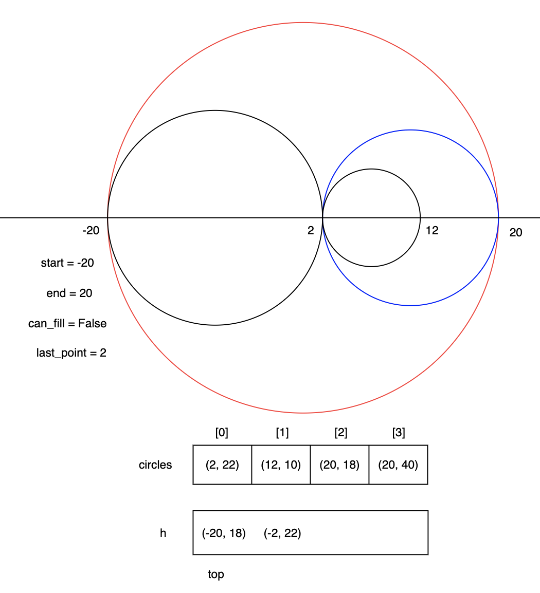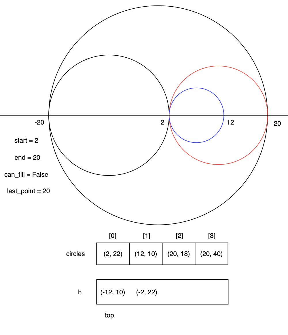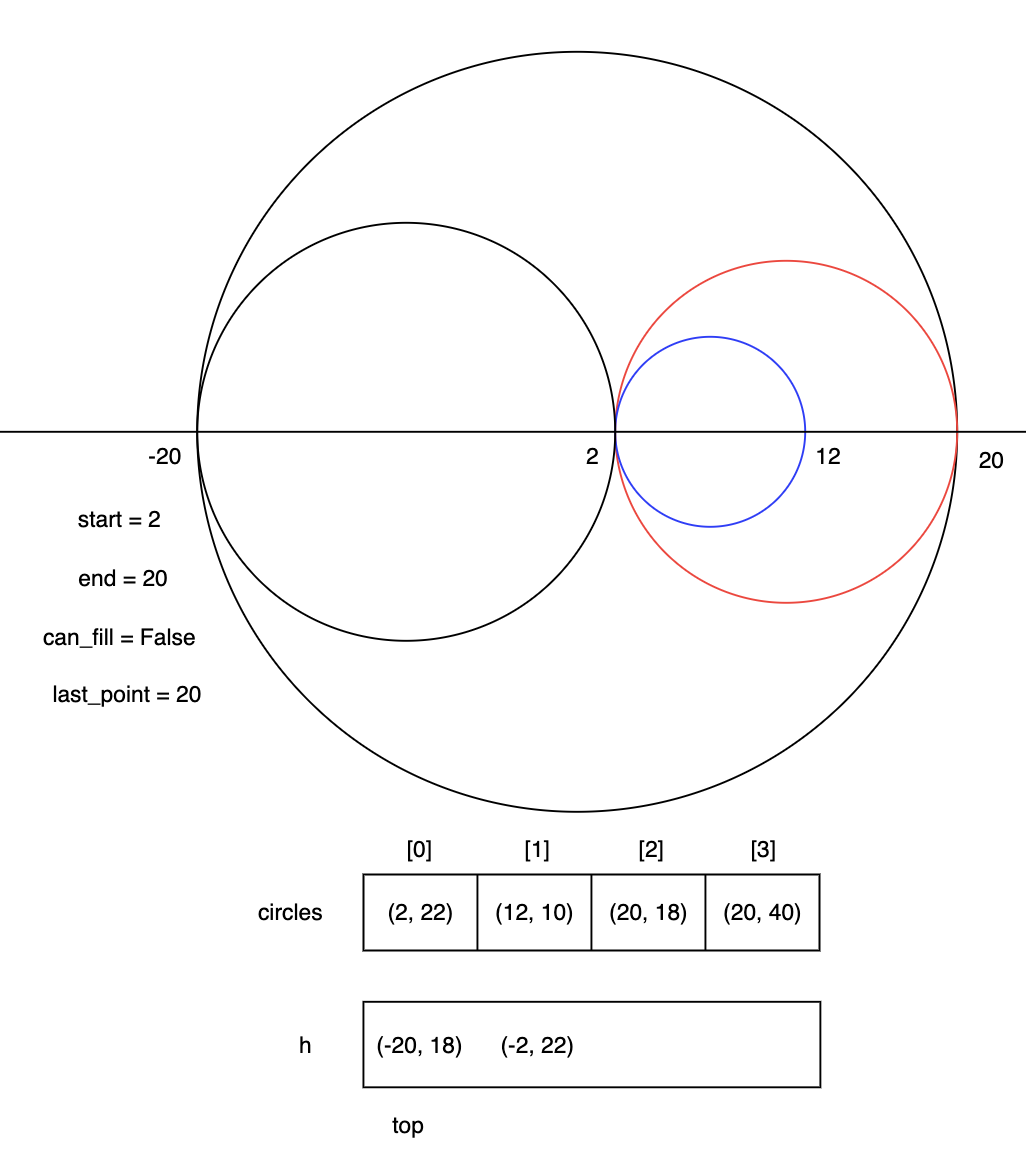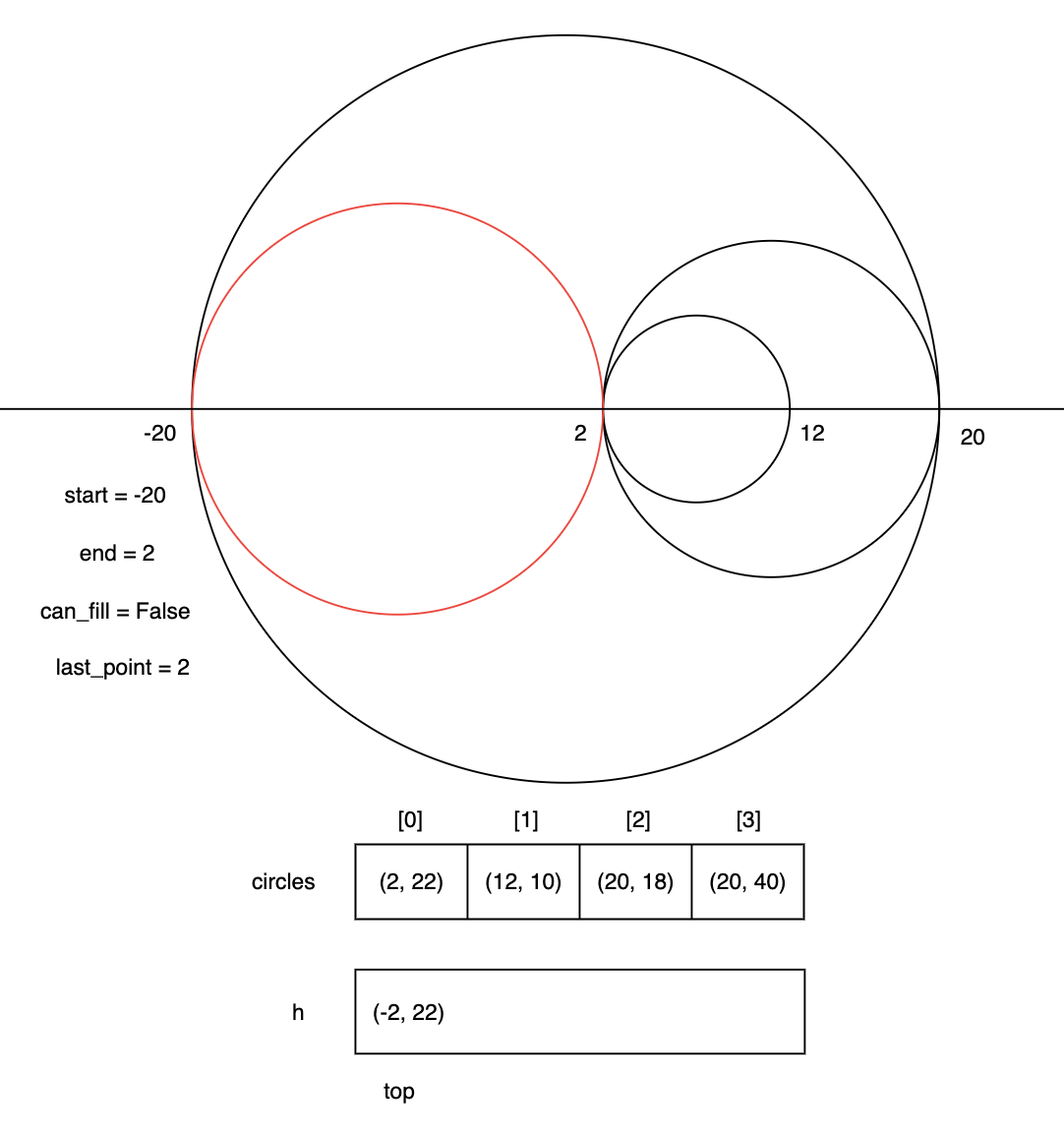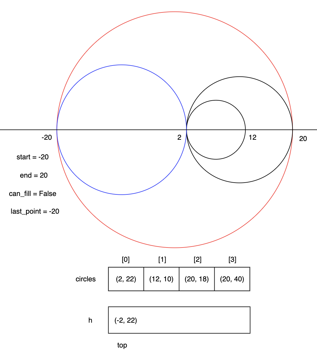 코드를 살펴보면 정렬을 진행한 뒤 첫 번째 원부터 마지막 원까지 내부를 채울 수 있는지 검사하는데, 큐에 진입하기 전에 검사하려는 원의 시작점(start)를 구해준다. 또 last_point 라는 변수를 두었는데, 이는 원의 내부를 검사하면서 end 부터 last_point 까지는 이미 원들로 채워져 있다는 것을 의미한다.