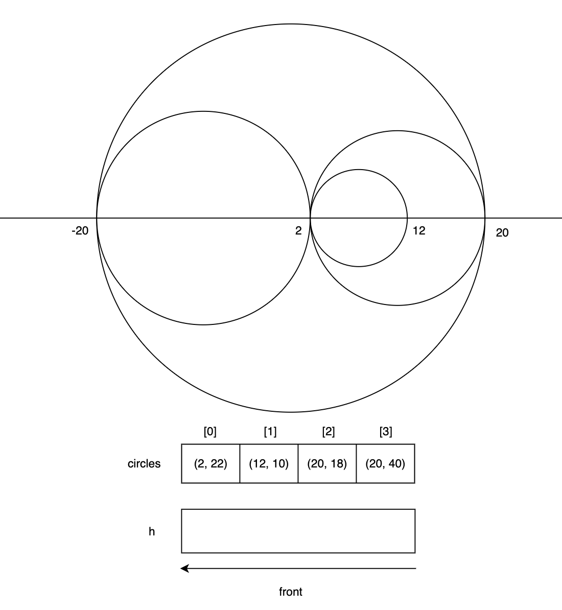 나는 시간을 단축하기 위해 원들의 정보를 (중심, 반지름)에서 (끝점, 지름)으로 바꾸고 정렬을 진행하였다. 이렇게 하면 circles 리스트에는 원의 끝점이 빠른 원이 앞에 올 것이고, 만약 끝점의 좌표가 같다면 지름이 작은 것이 앞에 올 것이다.