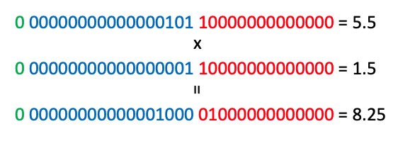 위와 같이 고정 소수점으로 나타낸 5.5와 1.5를 곱하면 아래의 결과를 얻을 수 있다. 이 값을 그냥 사용하게되면 우리가 연산의 결과로 기대하는 값과 아주 다른 값이 나온다. 그리고 만약 1.5가 아닌 조금만 더 큰 수를 곱했다면 표현할 비트가 모자라 오버플로우가 발생했을 수도 있다. 따라서 고정 소수점을 사용한 두 수를 곱할 때는 먼저 앞의 수를 (int64) 자료형으로 타입 캐스팅을 진행한 뒤에, 두 수를 곱하고 $ 2^{14} $으로 나누는 연산이 필요하다. 그 결과 아래와 같은 값을 얻을 수 있다.
