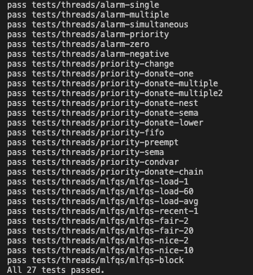 이렇게 mlfqs까지 구현을 완료하면 프로젝트 1에서는 다음과 같이 all pass를 받을 수 있다!