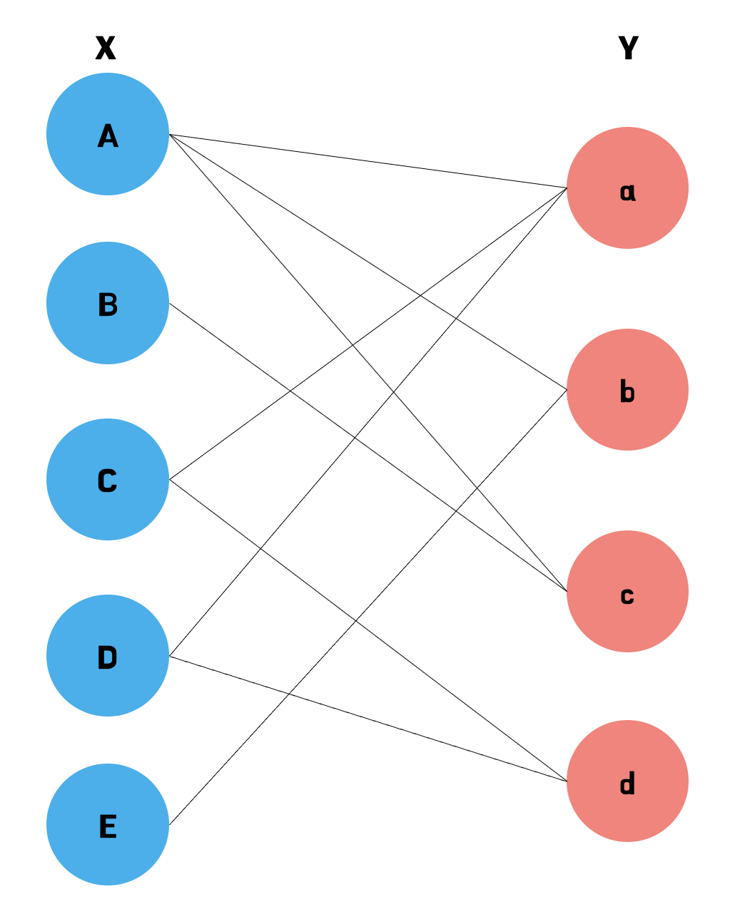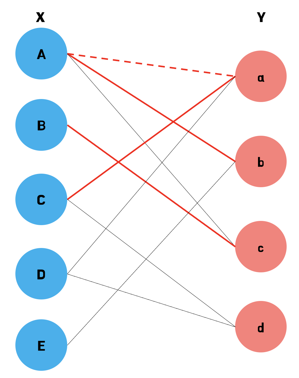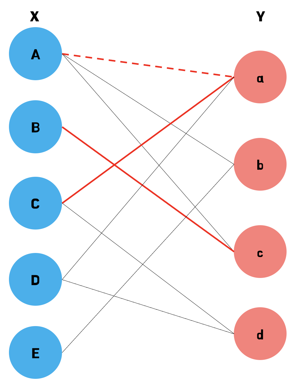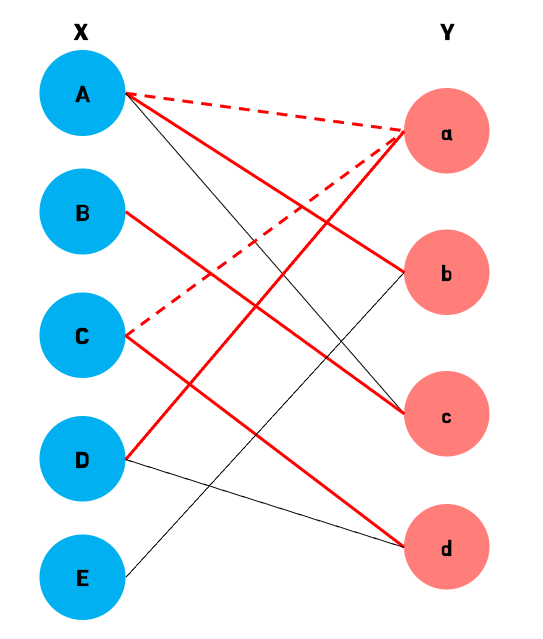 마지막 노드 E는 가능한 매칭이 (E, b) 뿐인데, 이 매칭이 선택될 경우 노드 A는 Y의 다른 노드와 매칭이 불가능하기 때문에 노드 E는 매칭이 될 수 없다. 따라서 가능한 최대 매칭은 위의 그림과 같이 네 가지가 선택될 수 있다.