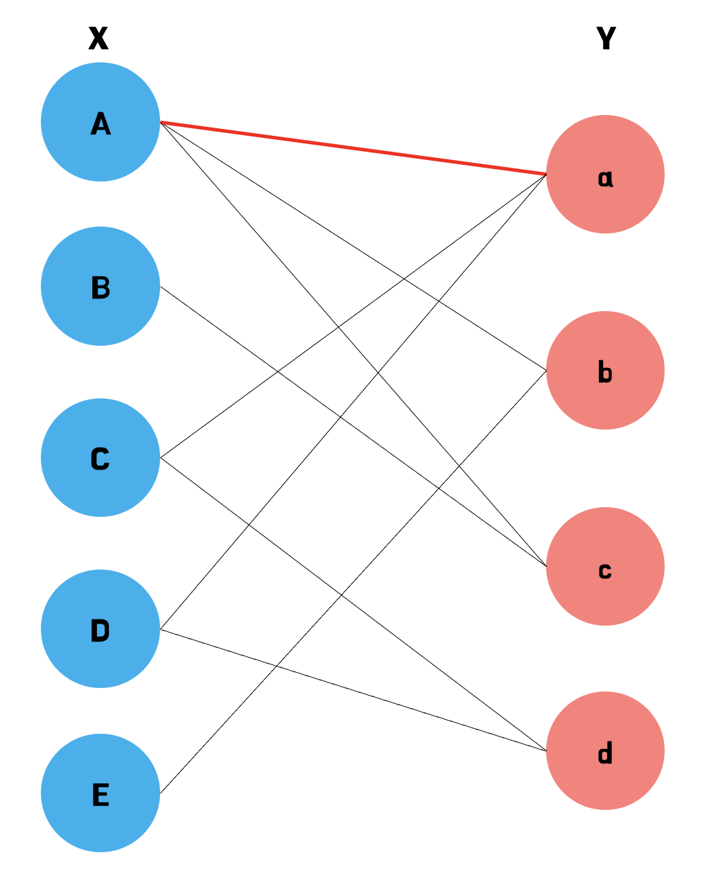 이분 매칭 알고리즘은 위와 같은 이분 그래프에서 최대 매칭의 개수를 찾는 것과 같다. 매칭이란 간선 하나를 선택하는 것을 말하는데, 예를 들어 그림에서 A와 a를 연결하는 간선을 선택하면 (A, a)라는 매칭이 생기는 것이다. 각 노드들은 딱 한 번만 선택이 되어야 하므로, 이 간선을 선택했을 때 A 또는 a와 연결되어 있는 간선은 더 이상 선택이 불가능하다.