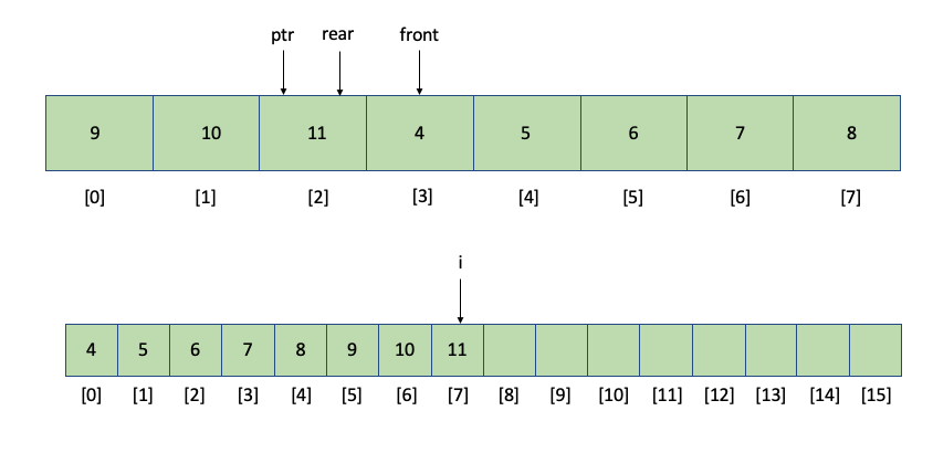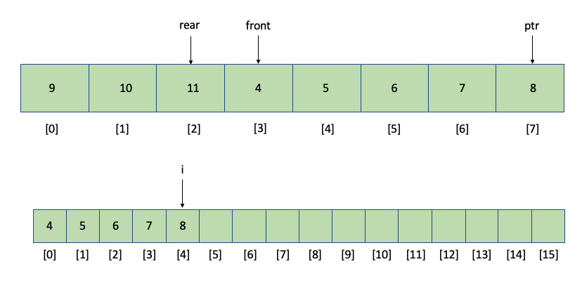 ptr 변수를 초기에 front와 같게 두고, rear와 같아질 때까지 +1씩 증가시키며 원소를 탐색한다. 이와 동시에 새로운 큐의 인덱스 i 또한 ptr과 같이 증가시키며 현재 ptr이 가리키고 있는 원소를 i가 가리키고 있는 자리에 복사한다.