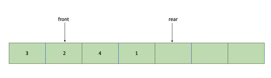 가장 기본적인 큐 자료구조는 리스트를 활용하여 구현한다. 리스트의 맨 앞부터 원소를 하나하나 쌓아나가고, 큐에서 원소를 삭제하면 가장 앞에 있는 원소부터 빠져나갈텐데, 삭제 연산을 진행할 때마다 맨 앞 원소를 실제로 지워버리면 매번 \(O(n)\) 만큼의 연산이 발생하기 때문에 오버헤드가 커진다. 이를 방지하기 위해 큐 자료구조는 큐의 맨 앞 위치를 나타내는 front와 맨 뒤 위치를 나타내는 rear 라는 변수를 두어 연산을 진행한다.