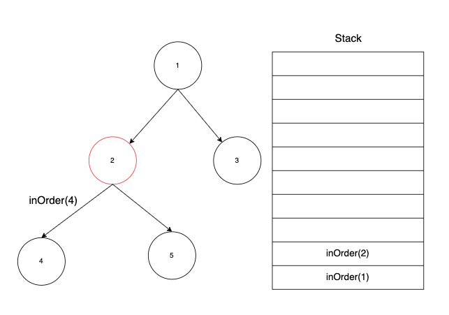 이제 다시 inOrder(2) 함수로 돌아왔는데, 왼쪽 자식의 순회가 끝났으므로 현재 노드를 방문 처리 한 뒤 다시 오른쪽 노드로 내려간다.
