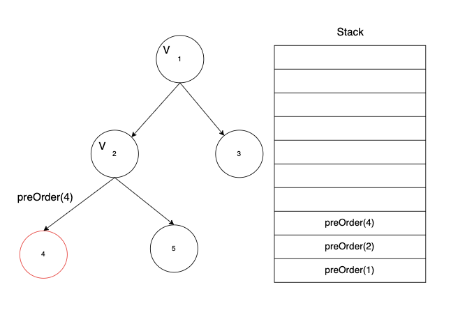 4번 노드의 경우 자식 노드가 존재하지 않기 때문에 함수가 종료되고, 다시 preOrder(2)로 돌아오게 된다.