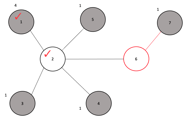 2번과 연결된 장소 중 아직 방문하지 않았고, 실내인 장소를 찾아 경로의 개수를 그림과 같이 증가시켜 준다. 이후 실외인 6번 장소로 이동한다. 이때도 마찬가지로 2번 장소를 다시 방문하는 일이 없게끔 2번 장소에 방문 처리를 해준다.